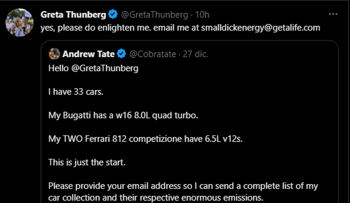 “Hola, @GretaThunberg. Tengo 33 coches. Mi Buggati tiene un w16 8.0L quad turbo [haciendo referencia al tipo de motor]. Mis DOS Ferrari 812 de competición tienen un 6.5L v12s. Esto es solo el principio. Por favor, proporciona tu dirección de correo electrónico para que pueda enviarte una lista completa de mi colección de coches y sus respectivas emisiones enormes”.
