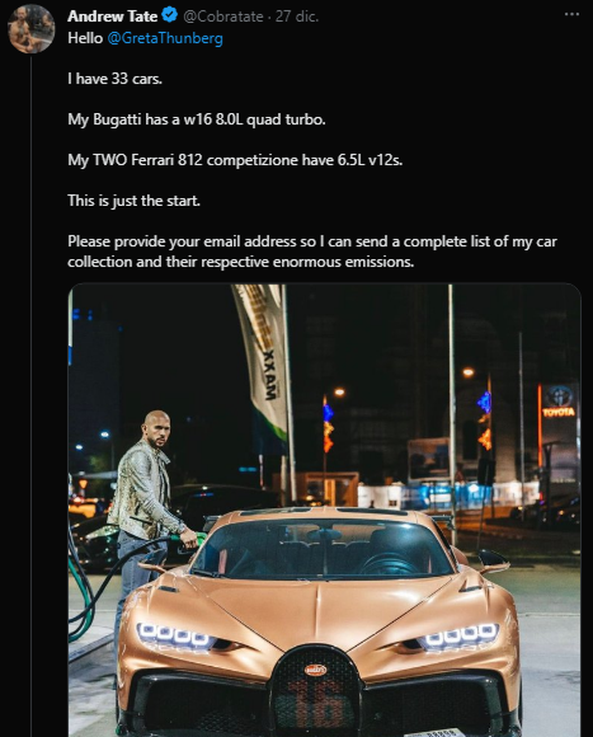 Andrew Tate realizó el tuit el martes 27 de diciembre y en este se jactaba de su colección de autos de lujo con gran capacidad para contaminar el medioambiente. Además, adjunto una foto con uno de sus vehículos y arrobó a Greta solo para molestarla.