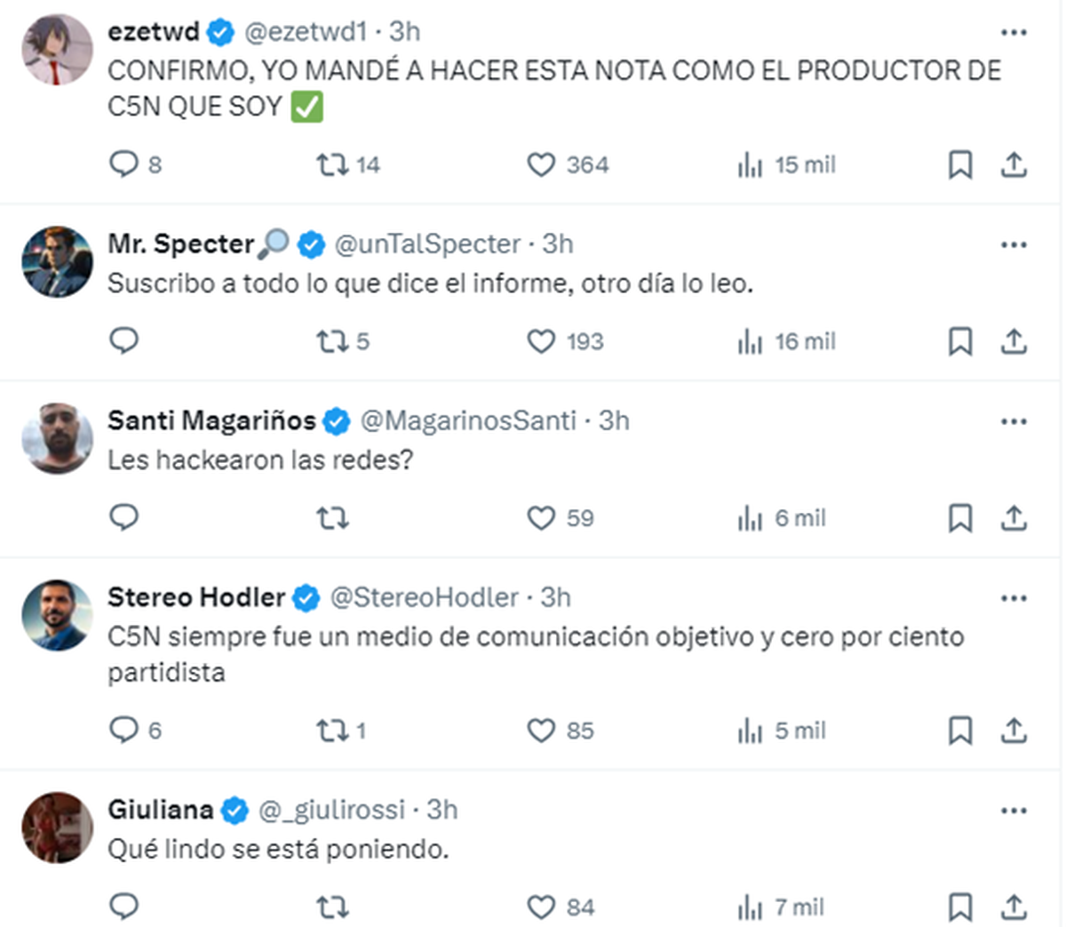 Más curioso aún es que los periodistas de la pantalla de C5N fueron sumamente críticos con la medida de cesar las actividades de Télam. Por este motivo, los internautas comenzaron a especular con una explicación para comprender tal posteo y algunos hasta aventuraron con la chance de que las redes de la señal había sido 'hackeada'.