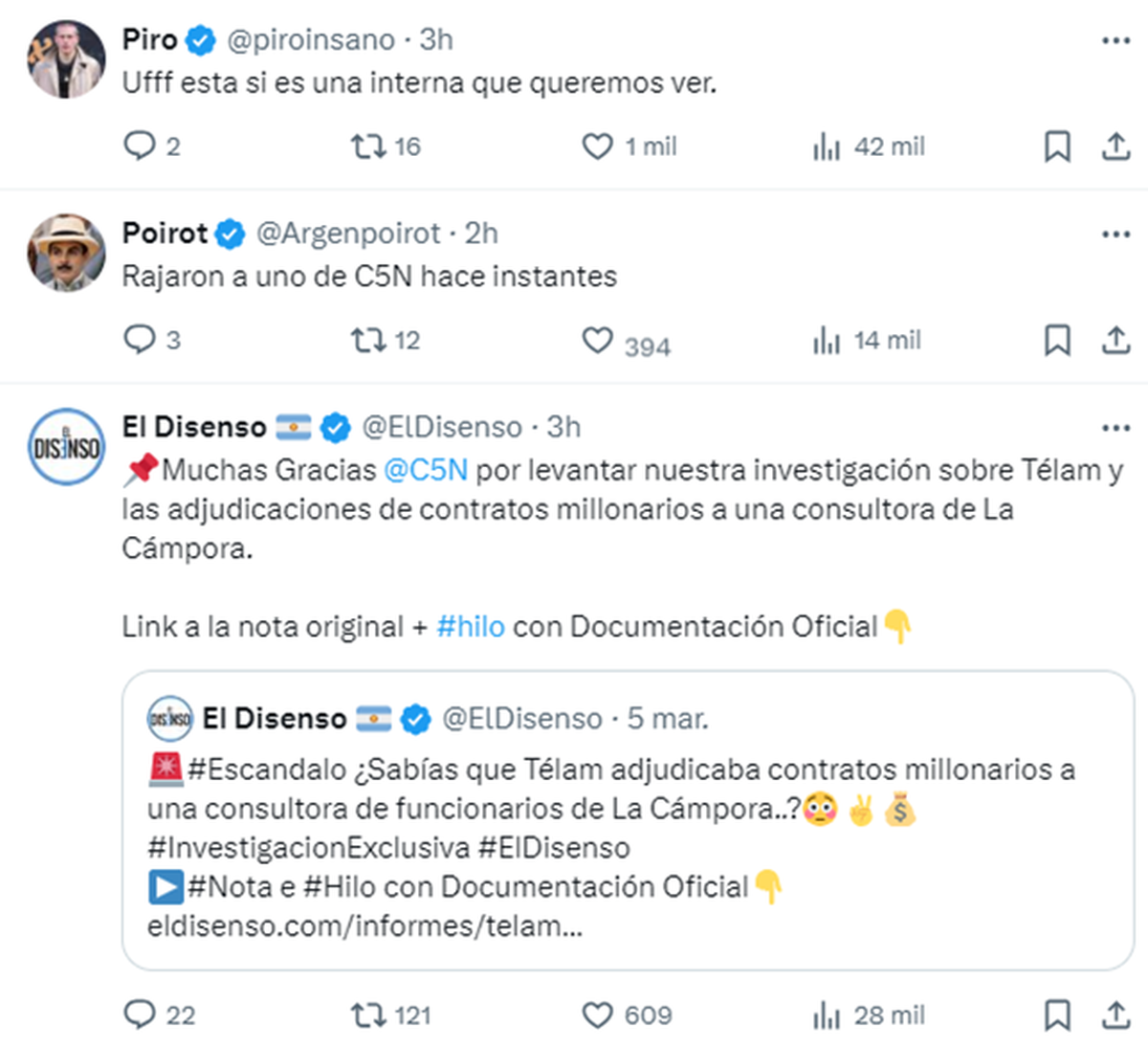 Un enorme revuelo se generó X (ex Twitter) luego de que la cuenta oficial de C5N compartiera una nota de su web contra Télam y dos dirigentes de La Cámpora.