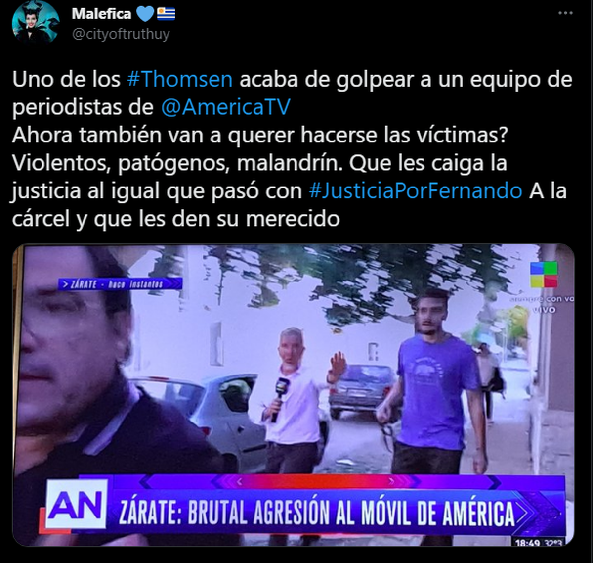 El cronista en este caso se trataba del periodista Gabriel Prósperi. Según declaró él mismo, más tarde de concluida la agresión, la madre de Thomsen fue quien inició con los ataques. Luego llegó el hermano de Máximo, Marciel Thomsen quién lo atacó con mayor agresividad. Y el tercer atacante, al parecer, se trató del padre. El camarógrafo se encuentra hospitalizado.