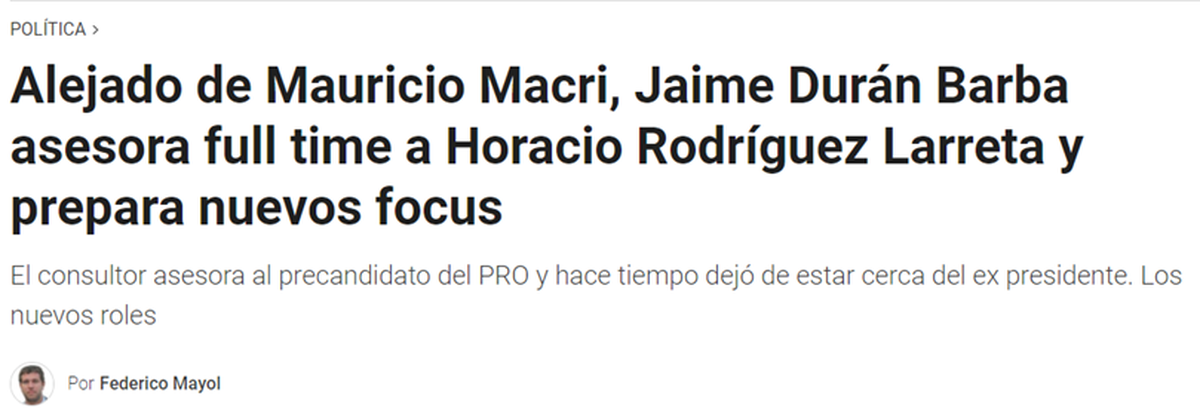 En la jornada del viernes (19/5) Infobae publicó una nota titulada Alejado de Mauricio Macri, Jaime Durán Barba asesora full time a Horacio Rodríguez Larreta y prepara nuevos focus, la cual sostiene que el consultor ecuatoriano está totalmente abocado a la campaña presidencial del Jefe de Gobierno porteño.