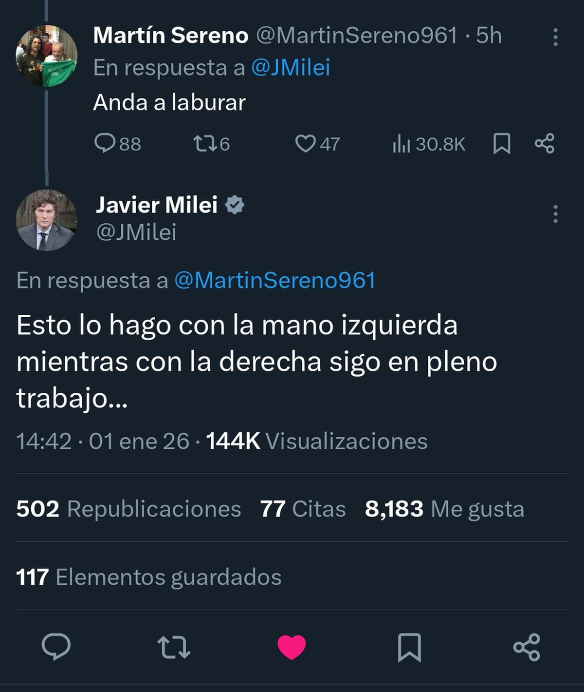 El inicio del 2026 encontró a Javier Milei sumergido en su mundo digital, interactuando durante casi dos horas con distintos usuarios desde su cuenta personal y haciendo algunas referencias culturales o lanzando provocacione, como siempre tiene acostumbrados a los argentinos.
