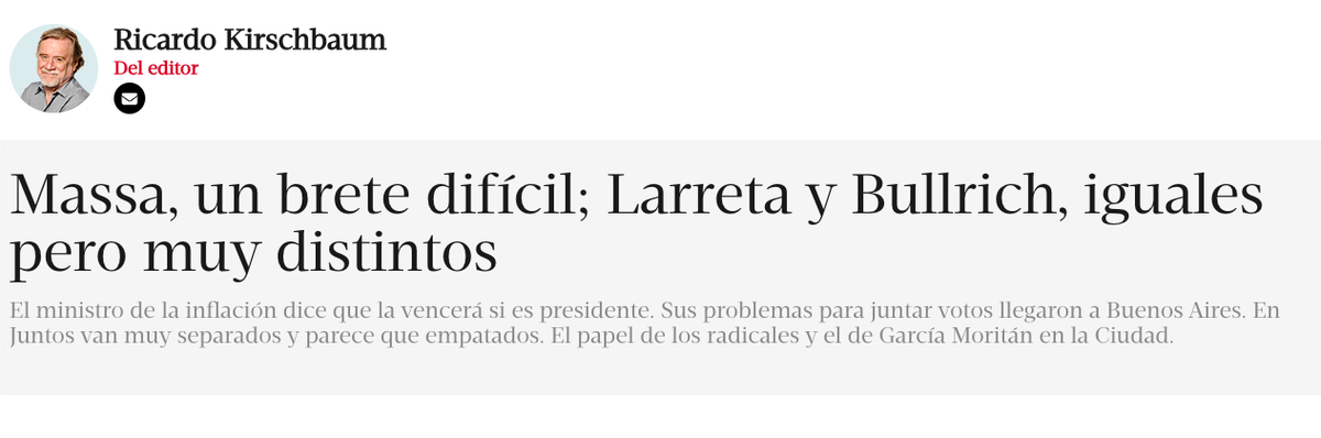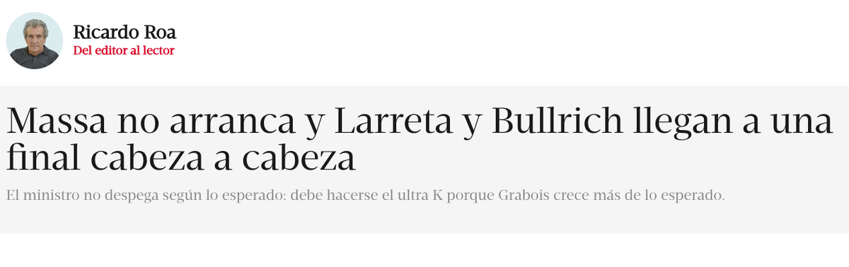 Ricardo Kirschbaum (secretario general de redacción) y Ricardo Roa (editor general adjunto), quienes venían jugando al policía bueno y al policía malo, salieron a sobreactuar oposición contra Sergio Massa por la inflación y se metieron de lleno en “las metidas de pata de Patricia Bullrich” por su completo desconocimiento sobre la economía, principalmente cómo salir del cepo, y su idea de un blindaje del FMI, que trajo a la campaña 2023 los spots de Fernando de la Rúa en 2001 cuando ella era ministra de Trabajo.