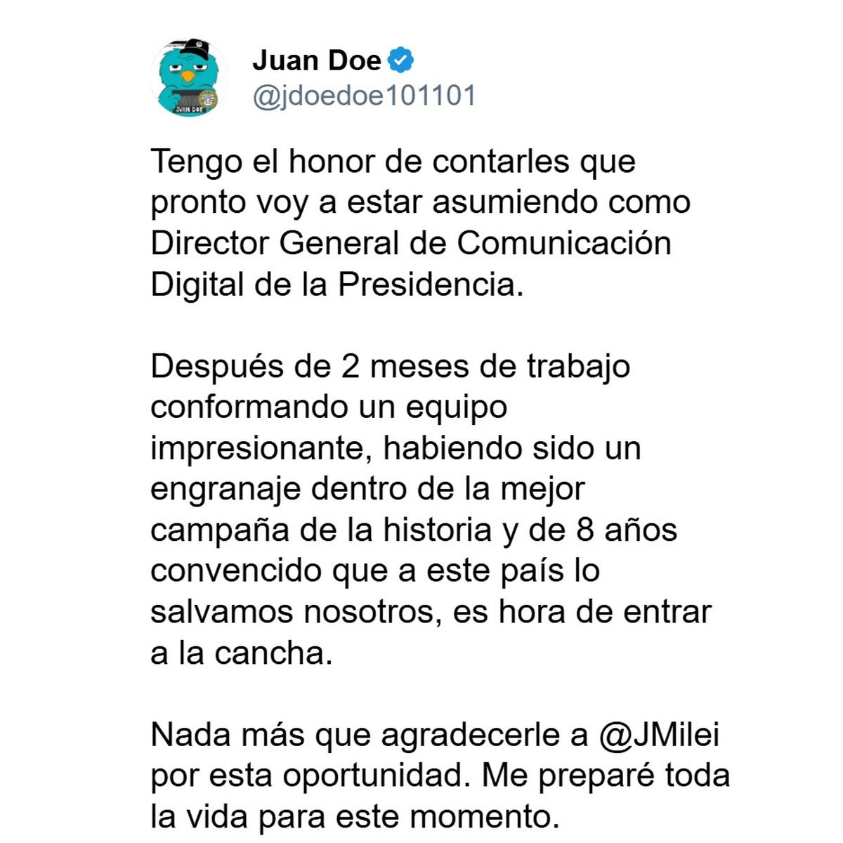 El troll libertario Juan Doe, que juraba no tomar cargos públicos, hoy es el jefe de la Oficina de Respuesta Oficial y desmiente "fake news" para Javier Milei.