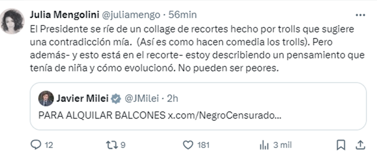 Durante la tarde de hoy (martes 1/10) múltiples cuentas pertenecientes a la militancia digital de Javier Milei compartieron un clip recortado de la emisión de Segurola de Futurock con una aparente contradicción de Julia Mengolini. Como es costumbre en estos casos, el mandatario se hizo eco del material y lo reposteó en X (ex Twitter), a modo de burla.