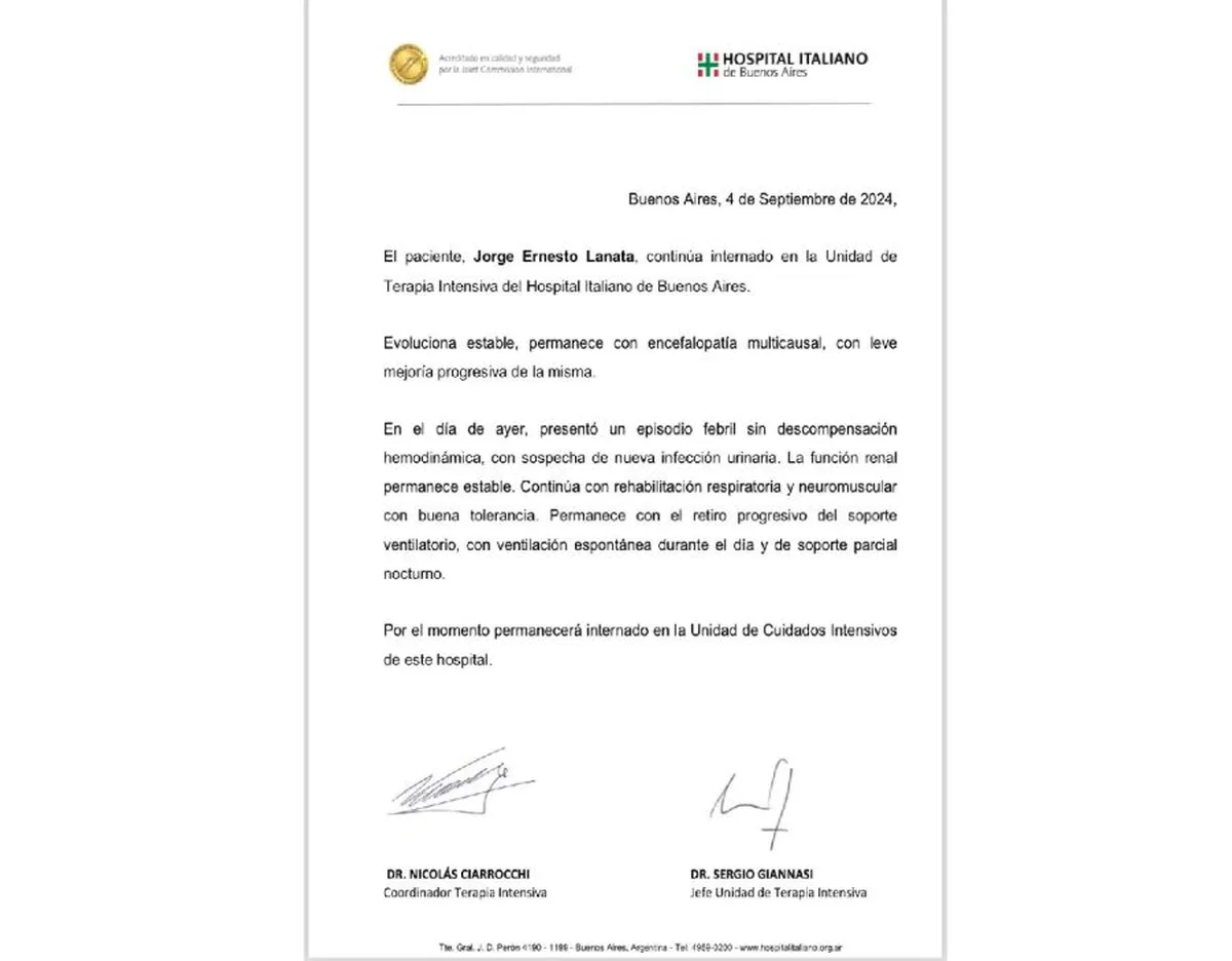 Según indica el informe firmado por el Coordinador de Terapia Intensiva y el Jefe de la Unidad, el periodista "evoluciona estable, permanece con encefalopatía multicausal, con leve mejoría progresiva de la misma".