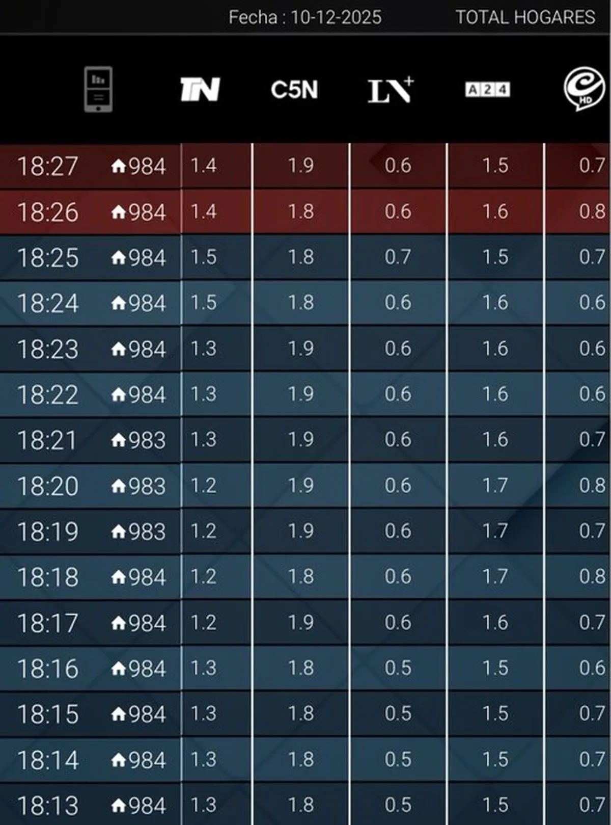 Encabezaba C5N (que no aborda el tema de manera muy intensa) y luego A24 con 1,7 y TN con 1,4 puntos. En cuarto lugar Crónica con 0,7 puntos y quinto LN+ con apenas 0,6.