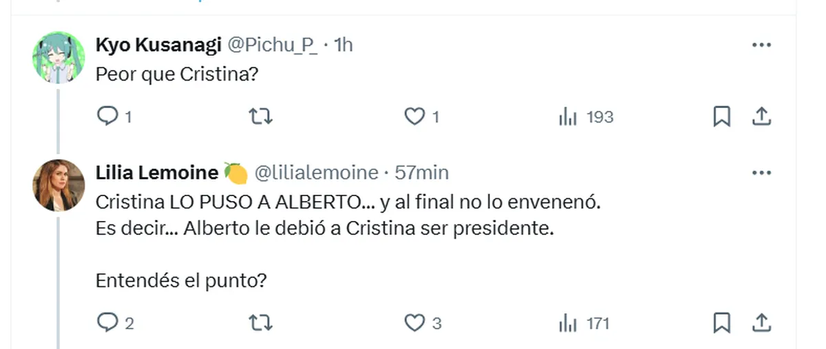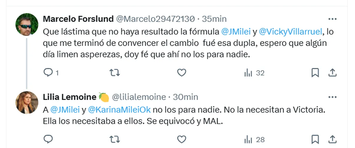 En su cuenta de X (Twitter) Lemoine escribió: "Ya es la peor vicepresidente de la historia. Peor que el Chacho. Porque el Chacho no llegó colgado de las bolas de De la Rúa".