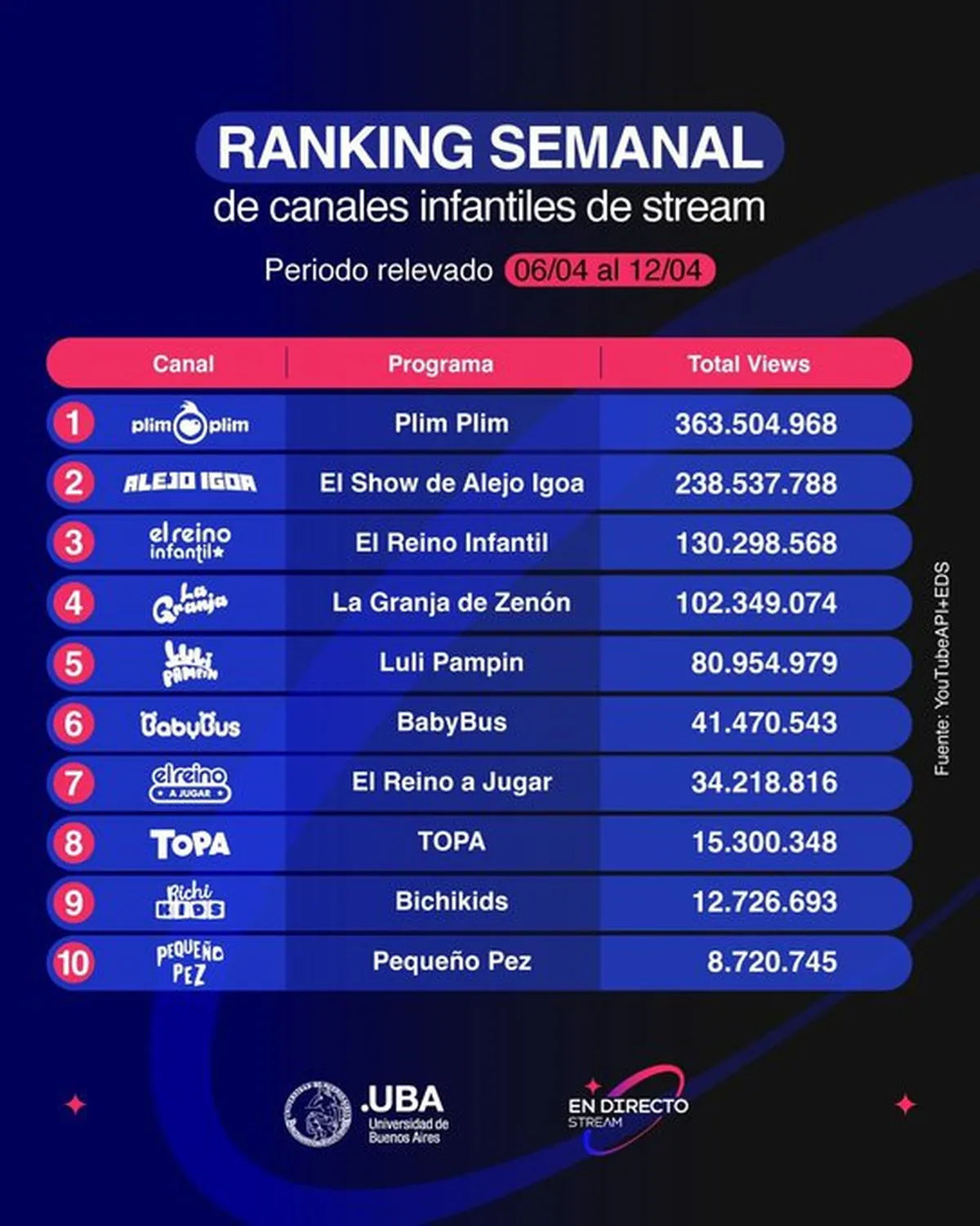 El nivel de visitas que alcanzan los canales de streaming argentinos para niños sorprenden: pueden sumar centenares de millones de visitas en apenas una semana porque los más chicos ya no se amoldan a las rígidas programaciones tradicionales y escogen qué van a ver en sus propias pantallas, a cualquier hora del día.