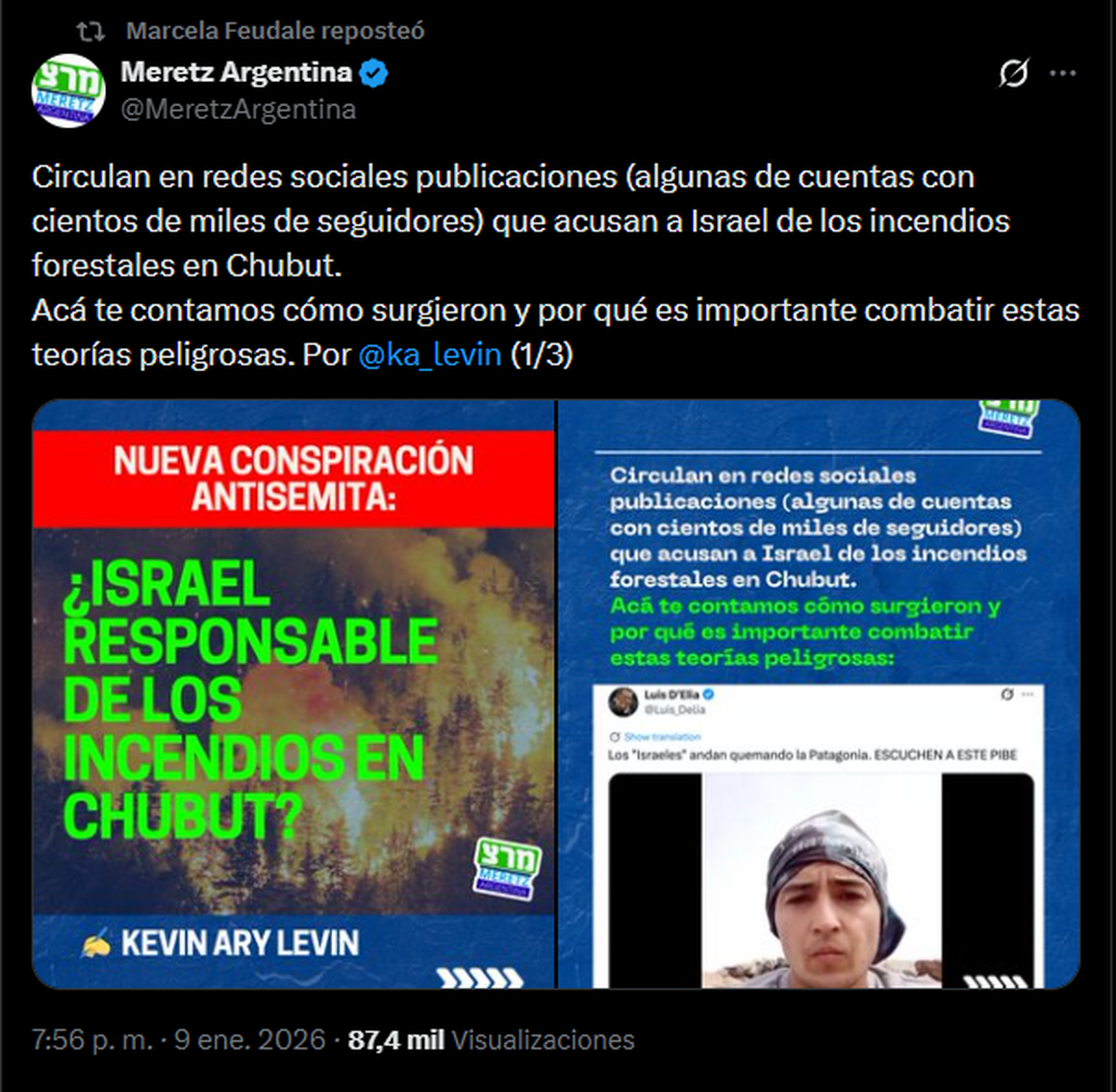 Al mismo tiempo, Meretz Argentina, un partido político israelí de izquierda, difundió un hilo que Feudale reposteó donde se explicaba que el origen del rumor era un video grabado en Santa Cruz y no en Chubut, además de fotos de granadas viejas que circulaban como si fueran pruebas de una operación extranjera, cuando en realidad se trataba de una teoría conspirativa antisemita montada en redes.