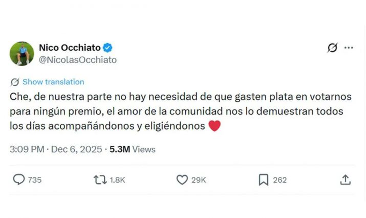 El que primero marcó distancia fue Nico Occhiato, que se paró desde un lugar muy claro y muy propio del ADN de Luzu: "No hay necesidad de que gasten plata en votarnos", escribió en X, y después lo repitió en su propio streaming, donde agregó que "no está bueno que el cariño de la gente se traduzca en un pago por SMS, menos en un premio que recién arranca". Frase que cayó directamente en Telefe y OLGA, que organizan la ceremonia y que, según fuentes del propio canal, esperaban un apoyo unificado.