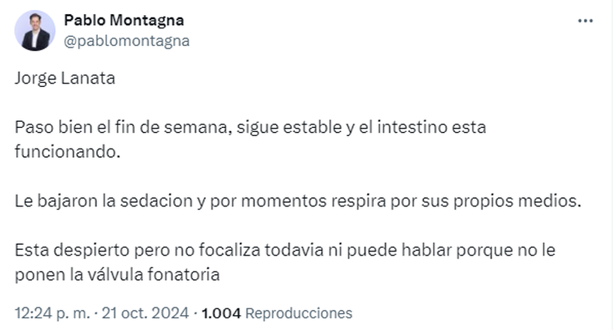 Esto último fue informado por el periodista Pablo Montagna a través de su cuenta de X (ex Twiter) el estado actual del conductor de Radio Mitre, además de agregar que "le bajaron la sedación y que por momentos respira por sus propios medios" aunque todavía "no focaliza ni puede hablar".