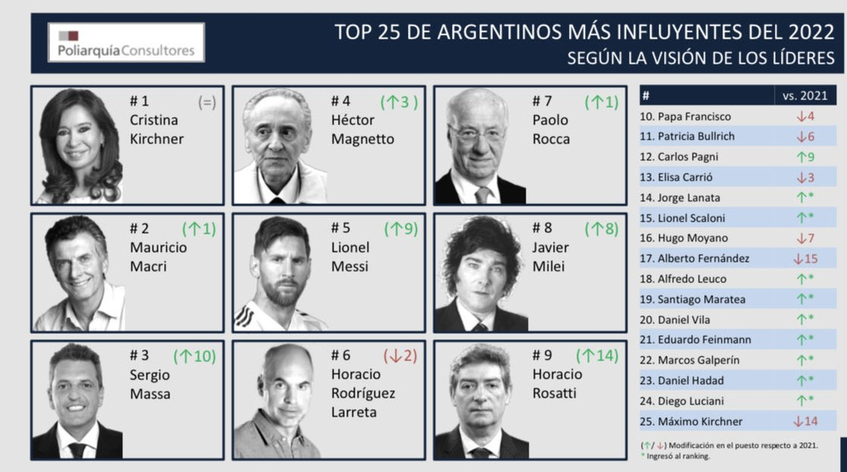 Entre otras sorpresas, caben destacar la aparición del astro argentino y recientemente campeón del mundo, Lionel Messi, quien llegó hasta la quinta posición; el diputado libertario, Javier Milei, quien ascendió hasta el octavo lugar y, por último, el Ministro de la CSJN, Horacio Rosatti, cuya figura fue la que más lugares avanzó: nada más ni nada menos que catorce posiciones, hasta llegar a la novena plaza del ranking.