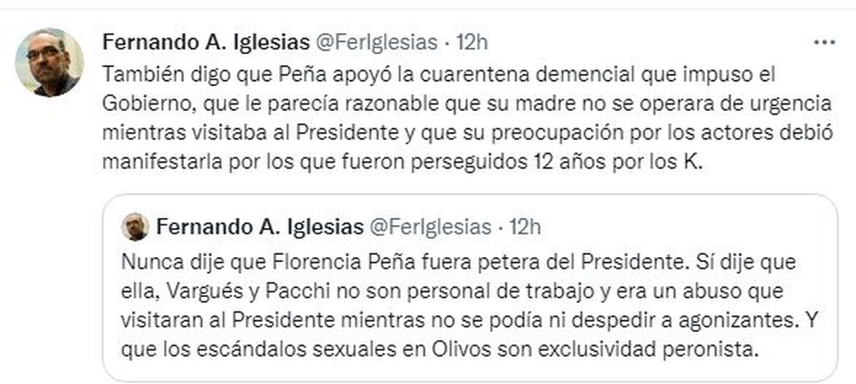 A su vez, Nancy Pazos disparó contra el diputado nacional Fernando Iglesias por sus comentarios misóginos y acusaciones que realizó contra Florencia Peña: "Creo que hay que tomar dimensión de lo que está pasando porque hoy, el diputado Fernando Iglesias volvió a twittear. Volvió a twittear, señores. Yo no lo puedo creer", repitió indignada. "La verdad es que compadezco a María Eugenia Vidal el tener que compartir lista con este hijo de puta"-siguió-"Yo también le exijo al Presidente que me diga si festejó su cumpleaños o no pero, en el medio, lo primero que hago es plantarme en la situación: Un diputado de la nación que le dice petera o que fue a hacer servicios sexuales y que se arrodilló. Ni quiero leerlo. Ese tipo todavía no pidió disculpas".