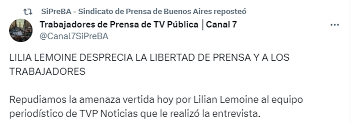 Sin embargo, el clip terminó viralizándose en redes sociales, a la vez que la TV Pública emitió un fuerte comunicado condenando los dichos de la funcionaria. Del mismo modo, el Sindicato de Prensa de Buenos Aires se unió al repudio e incluso Agustín Lecchi, Secretario General del gremio, se expidió ante lo sucedido.