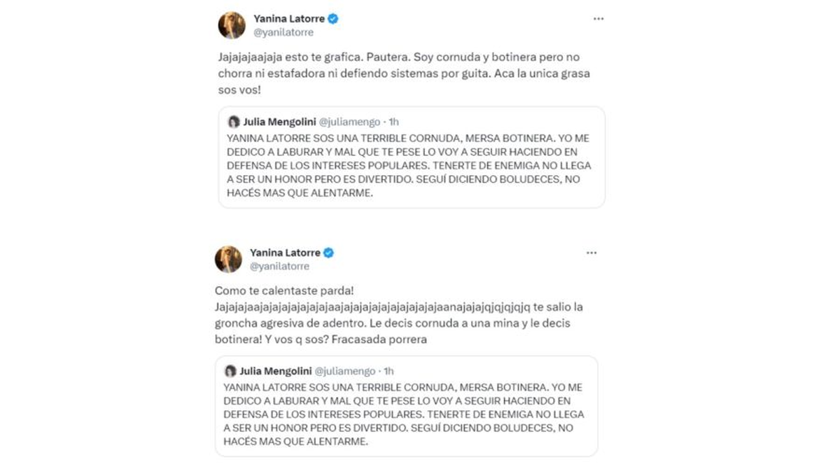 Por su parte, la panelista de C5N no se quedó callada y respondió vía X (ex Twitter) haciendo una parodia del célebre tuit que Mariana Nannis le escribió a la propia Latorre años atrás. Por su parte, la angelita redobló la apuesta mediante la misma plataforma, aunque amplió sus dichos nuevamente en sus ciclo en la radio digital.