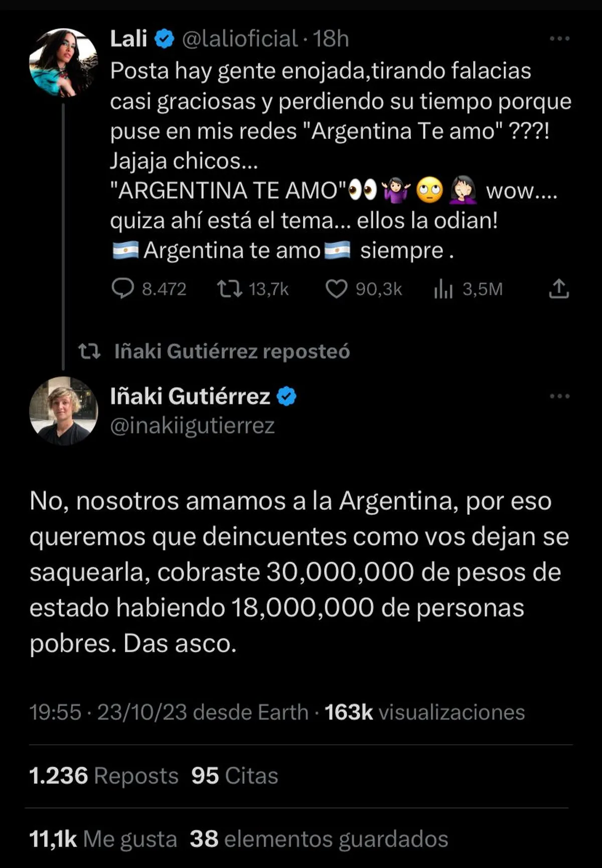 Pero eso no quedó ahí, ya que los votantes de La Libertad Avanza y Juntos por el Cambio comenzaron a cuestionar que la cantante recibe dinero del Estado y que es corrupta.