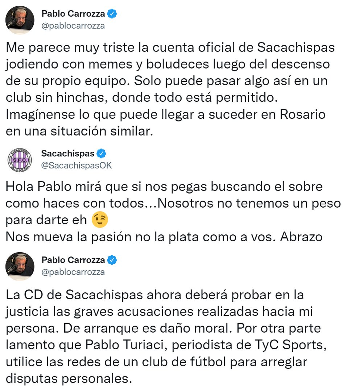 Evidentemente, la contestación del encargado de las redes sociales no le hizo ninguna gracia a Carroza, quien manifestó: "La CD de Sacachispas ahora deberá probar en la justicia las graves acusaciones realizadas hacia mi persona. De arranque es daño moral. Por otra parte lamento que Pablo Turiaci, periodista de TyC Sports, utilice las redes de un club de fútbol para arreglar disputas personales".