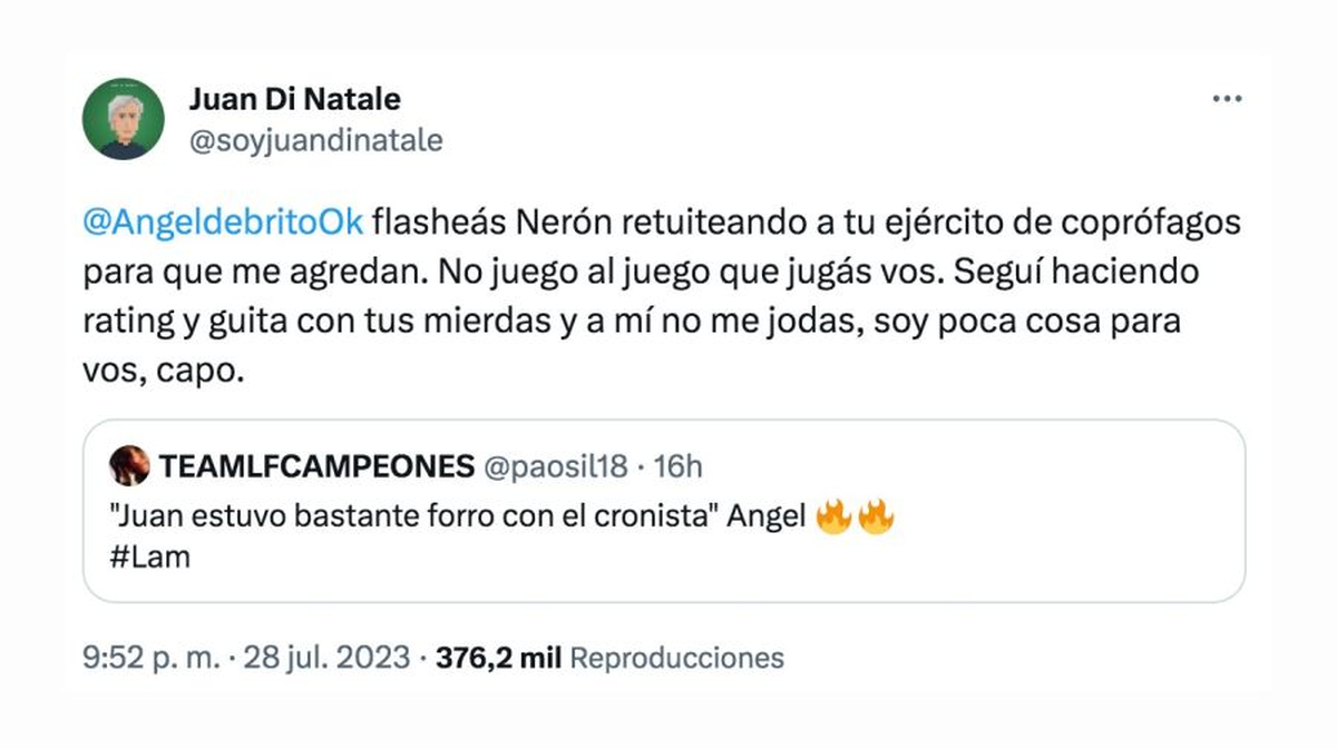 Juan Di Natale se negó a brindarle su testimonio a LAM por la escena de furia de Elizabeth Vernaci y estalló con Ángel de Brito en Twitter.