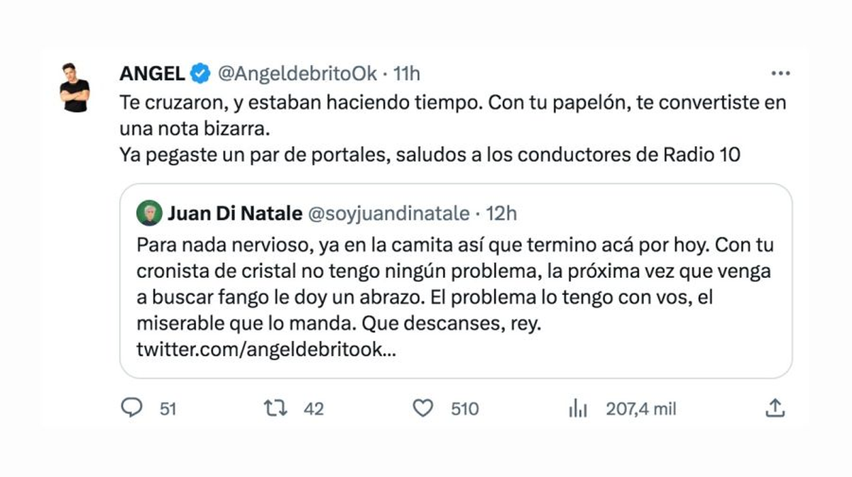 Sin embargo, horas más tarde, Di Natale estalló ante un comentario de De Brito durante el programa, quien remarcó su destrato para con Castelo. De esta manera, el periodista del Grupo Indalo apuntó sin filtro alguno contra el presentador de LAM y le espetó: "Seguí haciendo rating y guita con tus mierdas y a mí no me jodas".