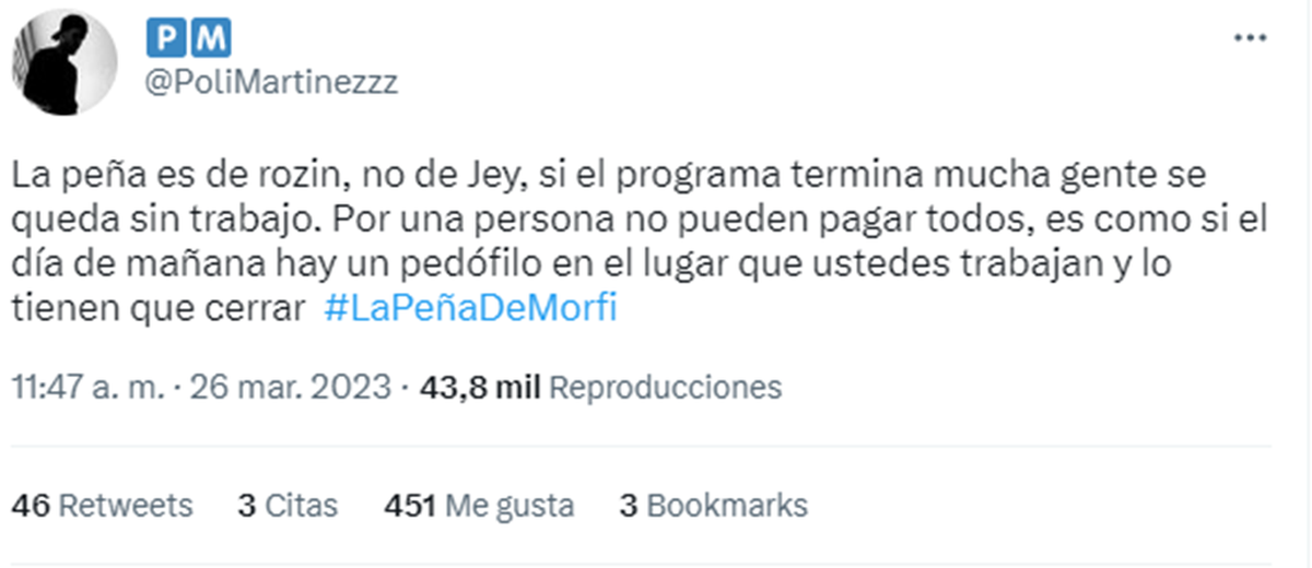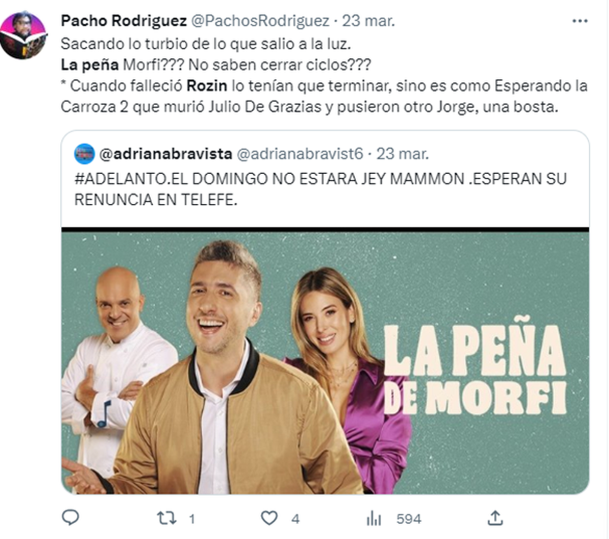 La denuncia contra Jey Mammón por abuso sexual sacudió a Telefe y decidió apartarlo de la conducción de La Peña de Morfi. El pasado domingo 26 de marzo, Jésica Cirio comenzó la emisión con un breve comunicado en el cual no mencionó a su compañero y, tras presentar a Georgina Barbarossa como reemplazante, el ciclo continuó como si nada pasara.