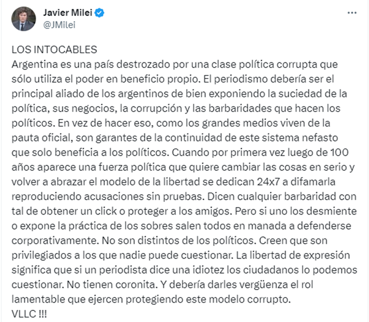 Milei citó el extracto en cuestión y lanzó un fuerte mensaje en el que volvió a condenar el uso arbitrario de la pauta oficial y cómo el periodismo, en vez de ser aliado de los ciudadanos, se une a los políticos.