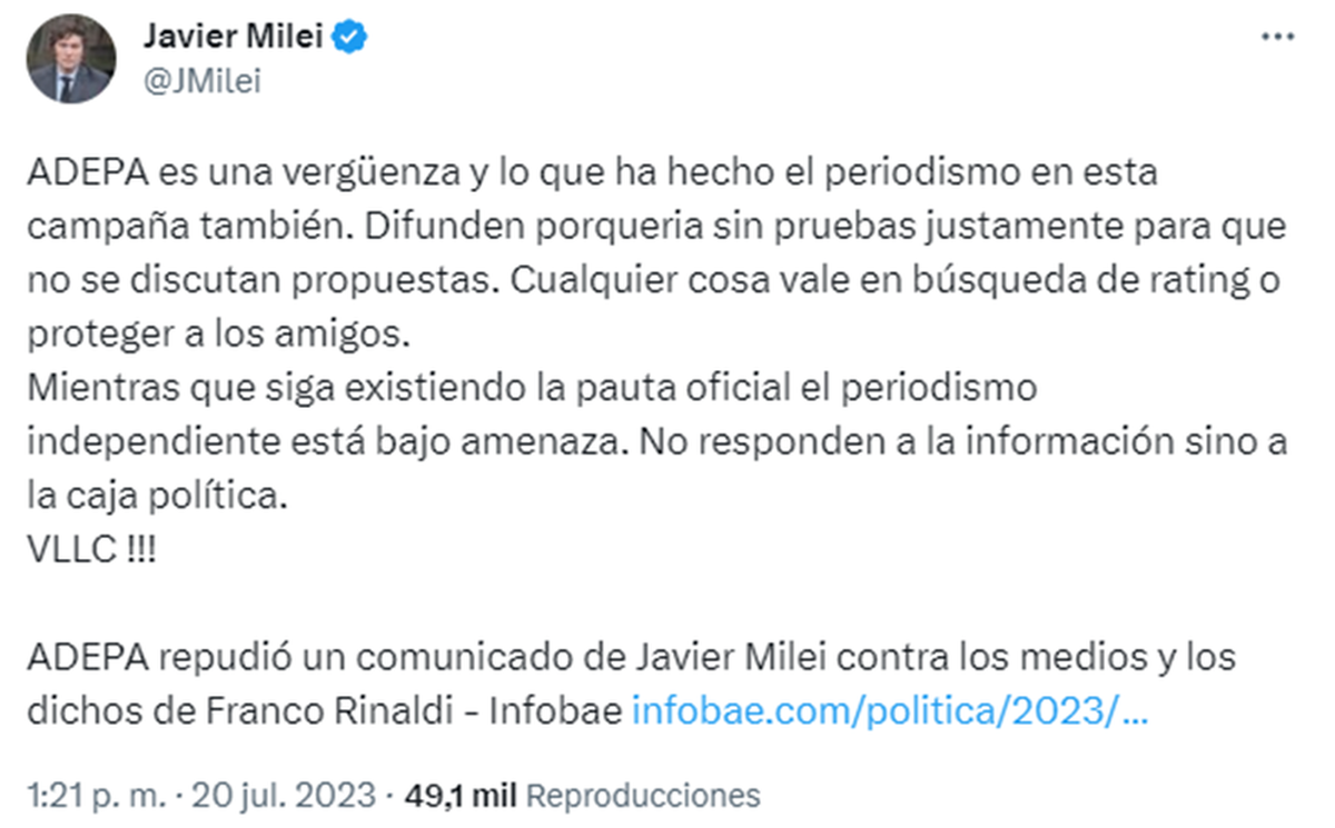 Este jueves (20/7) Javier Milei apuntó nuevamente contra el periodismo, en medio de la ola de denuncias mediáticas que sufrió, a raíz de los dichos que realizó su precandidata a diputada, Marcela Pagano, y a un repudio que recibió por parte de la Asociación de Entidades Periodísticas Argentinas (ADEPA).