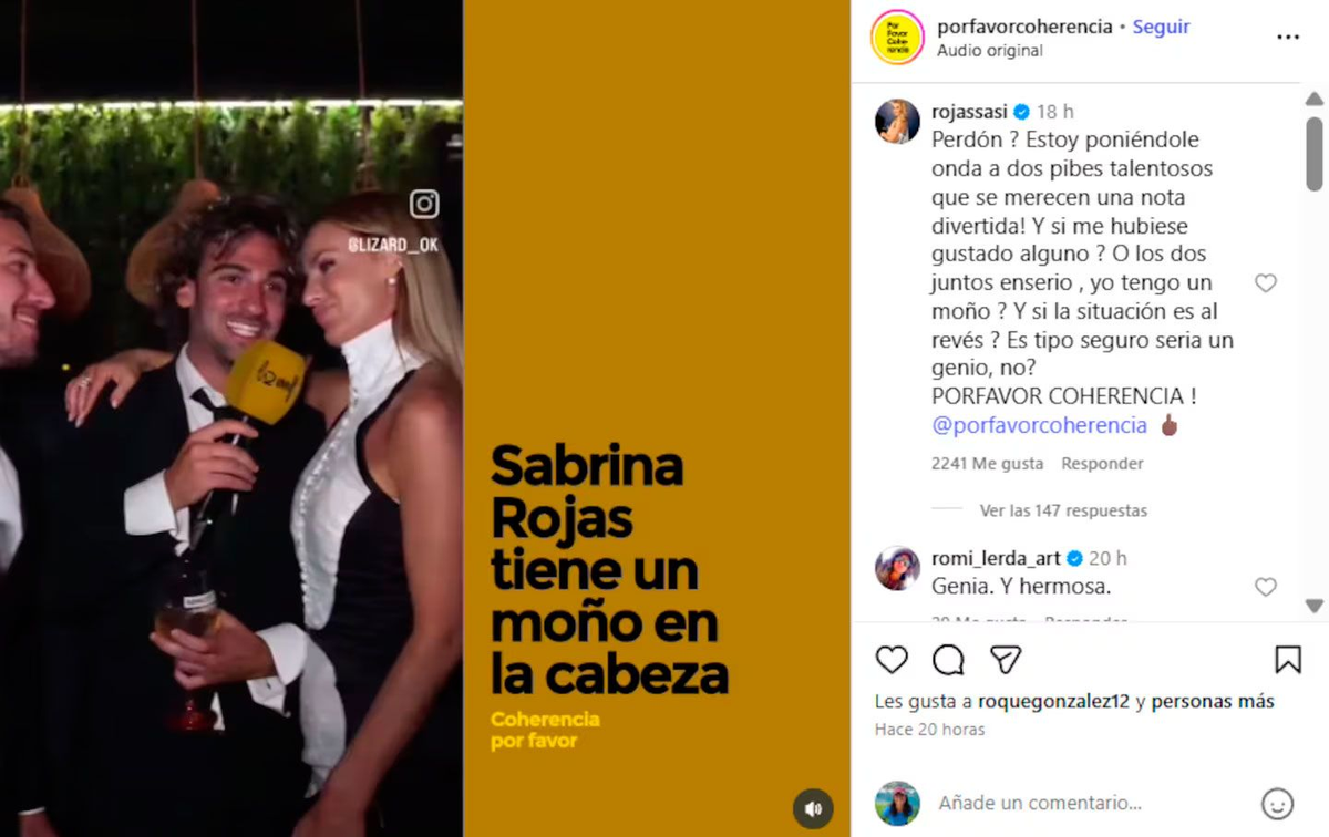 Sabrina decidió responder con claridad y sin filtros tanto a través de sus historias de Instagram como en el mismo posteo. Enumeró 6 puntos que explican la situación, aclarando que estaba poniendo onda a los chicos talentosos y señalando la doble vara de género que persiste en los medios: "Si la situación fuese al revés, el tipo sería un capo. Jamás se le diría ‘tiene un moño en la cabeza’", afirmó.