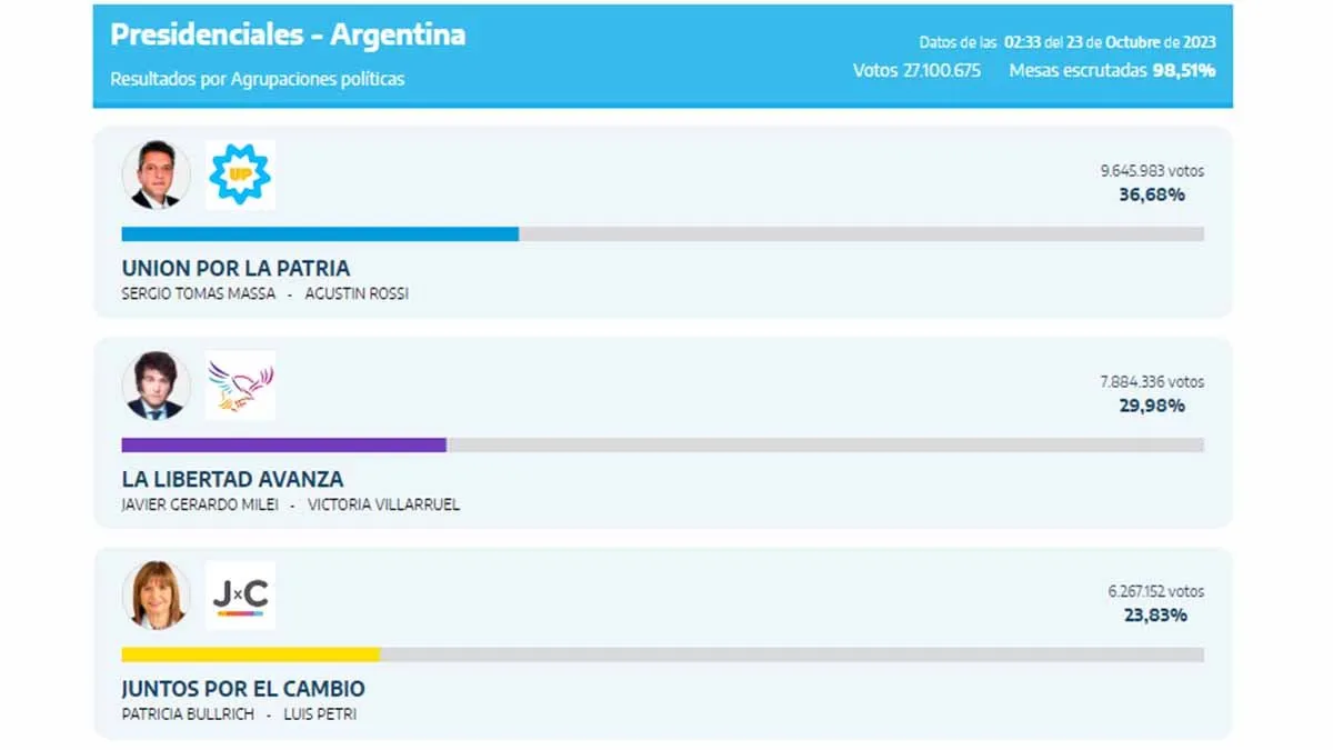 Tal como contó Urgente24, los datos de la Cámara Nacional Electoral confirman la victoria de Sergio Massa, de Unión por la Patria (UxP) con una ventaja de más de 6 puntos, escrutados ya más del 83% de los votos.