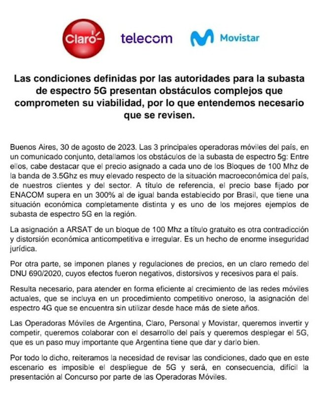 Las empresas señalaron que "el precio asignado a cada uno de los bloques de 100 MHz de la banda de 3.5 GHz es muy elevado respecto de la situación macroeconómica del país, de nuestros clientes y del sector", además de cuestionar las exigencias sobre la implementación de planes destinados a sectores de bajos ingresos.