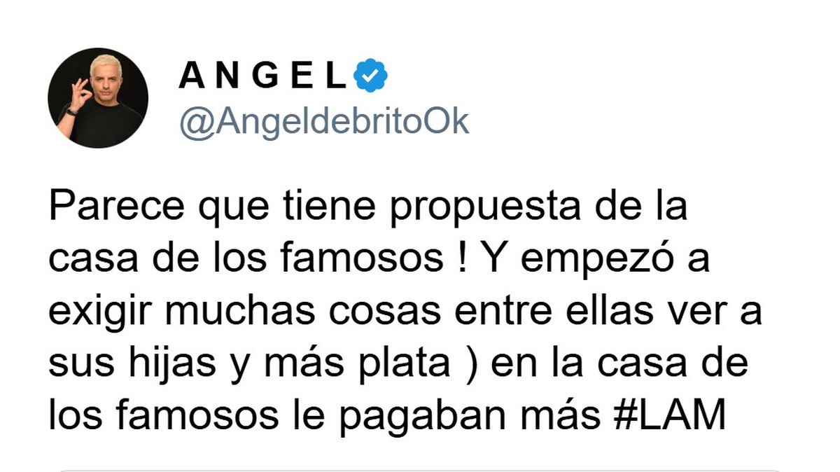 En paralelo, apareció otra versión que tiró combustible al fuego. Ángel de Brito publicó en su cuenta de X: "Parece que tiene propuesta de La Casa de los Famosos. Y empezó a exigir muchas cosas, entre ellas ver a sus hijas y más plata. En La Casa de los Famosos le pagaban más".