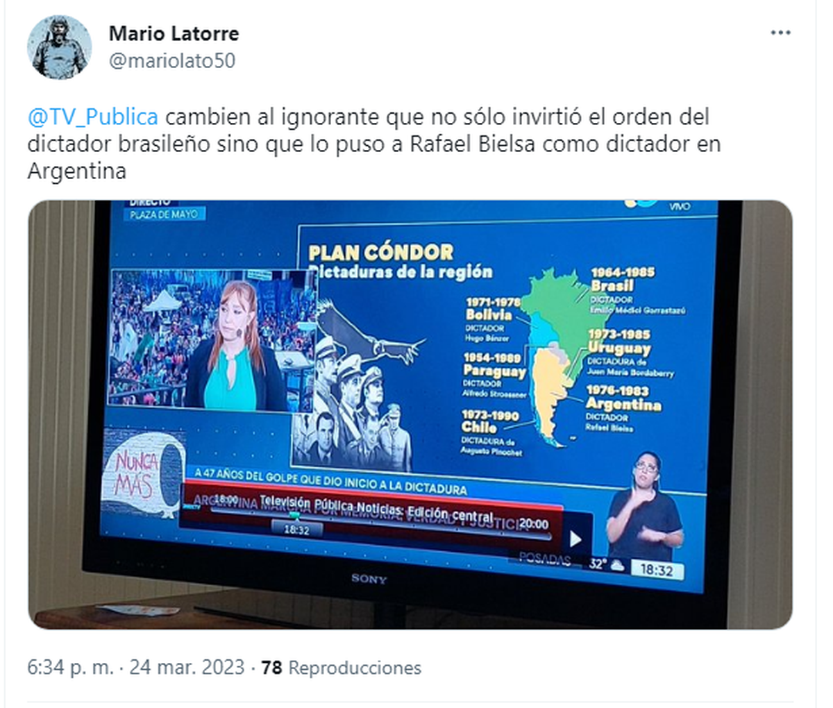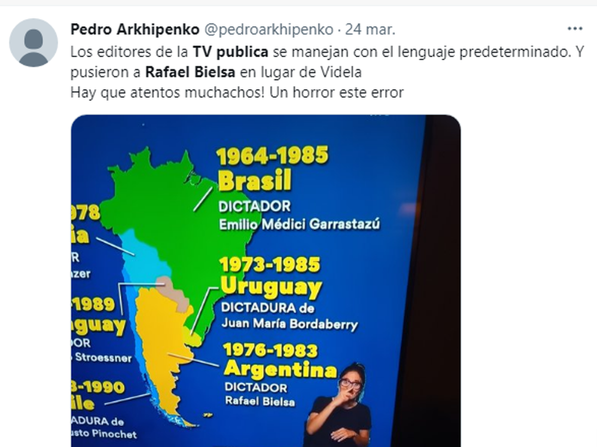 "Los editores de la TV publica se manejan con el lenguaje predeterminado. Y pusieron a Rafael Bielsa en lugar de Videla Hay que atentos muchachos! Un horror este error."