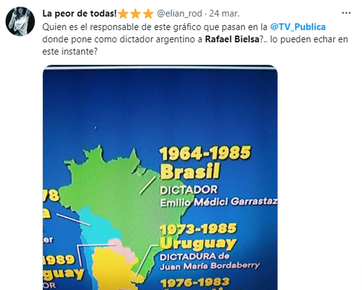 "Quien es el responsable de este gráfico que pasan en la @TV_Publica donde pone como dictador argentino a Rafael Bielsa?.. lo pueden echar en este instante?"
