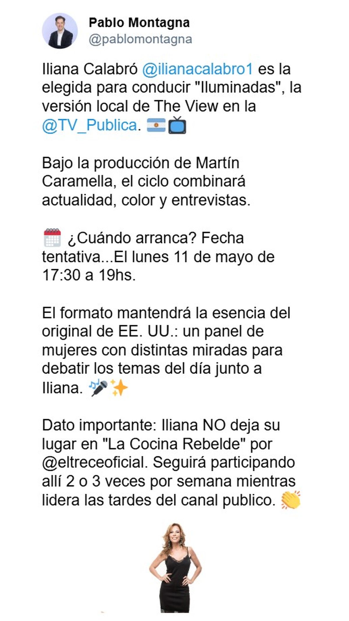 La conductora elegida es Iliana Calabró, que tomará las riendas del nuevo ciclo que se llamará Iluminadas, la versión argentina de The View. La noticia, que se conoció de primera mano por el periodista Pablo Montagna, confirma que el programa comenzará el lunes 11 de mayo de 17:30 a 19 horas, de lunes a viernes, y estará producido por Martín Caramella.