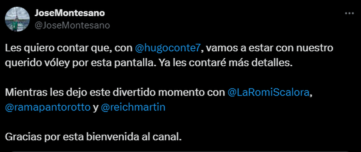 El mismo Montesano avisó: "Les quiero contar que, con @hugoconte7, vamos a estar con nuestro querido vóley por esta pantalla. Ya les contaré más detalles.".