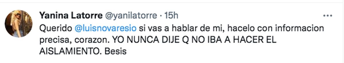 Uno de sus principales detractores había sido el periodista Luis Novaresio, quien no dudó en criticar a Yanina Latorre afirmando que la periodista se rehusaba a cumplir con el aislamiento obligatorio, una vez arribada a la Argentina. Sin embargo, la propia Yanina fue la quien salió con los tapones de punta contra el conductor de A24 a través de su cuenta personal de Twitter:
