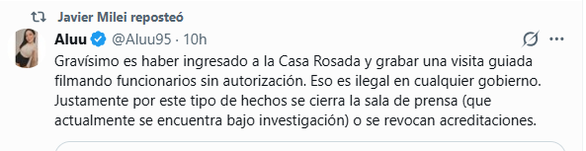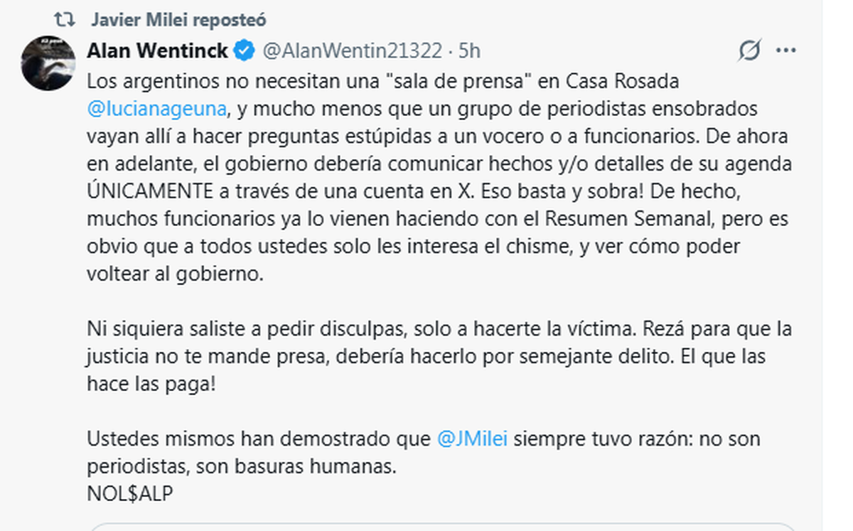 Entre los mensajes que el presidente reposteó, se destacó uno de la cuenta Alan Wentick que planteó el cierre definitivo de la Sala de Periodistas y que la comunicación oficial del Gobierno se maneje por comunicados "unicamente" a través de la red social X.