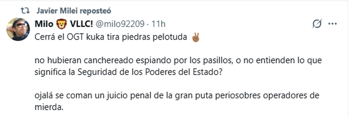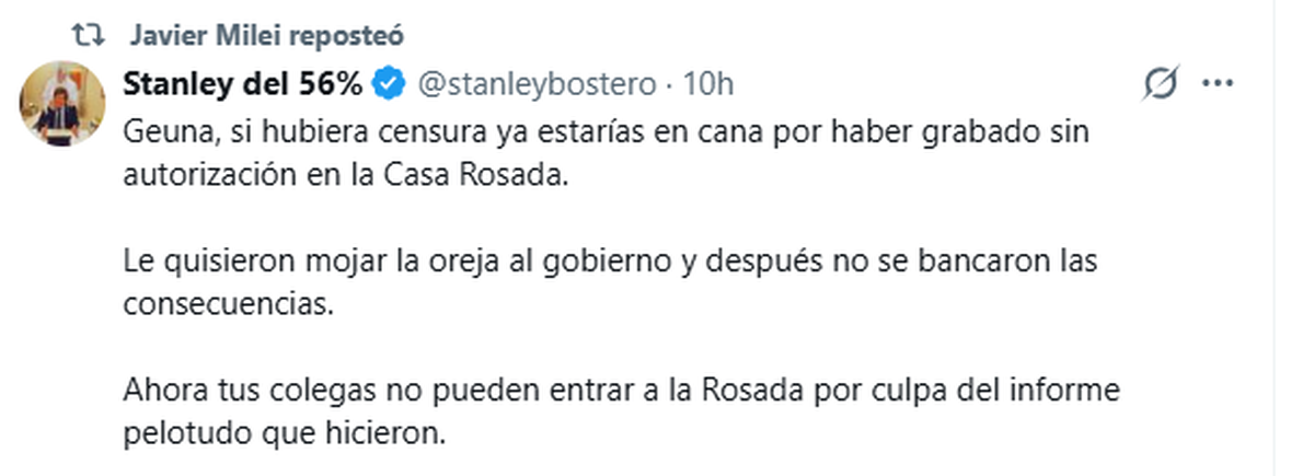 El primer mandatario replicó en su cuenta oficial de X mensajes de usuarios que contenían insultos y amenazas a la periodista además de acusaciones varias. Uno de los posteos que Milei eligió difundir fue el del portal La Derecha Diario, un medio militante libertario que al dar la noticia de las declaraciones de Geuna agregó el siguiente comentario: “¡NO ODIAMOS LO SUFICIENTE A LOS PERIODISTAS: La cínica operadora Luciana Geuna, lejos de hacerse cargo y pedir disculpas por el espionaje en Casa Rosada, salió a llorar una supuesta "censura" del Gobierno de Milei tras la denuncia presentada por Casa Militar”.