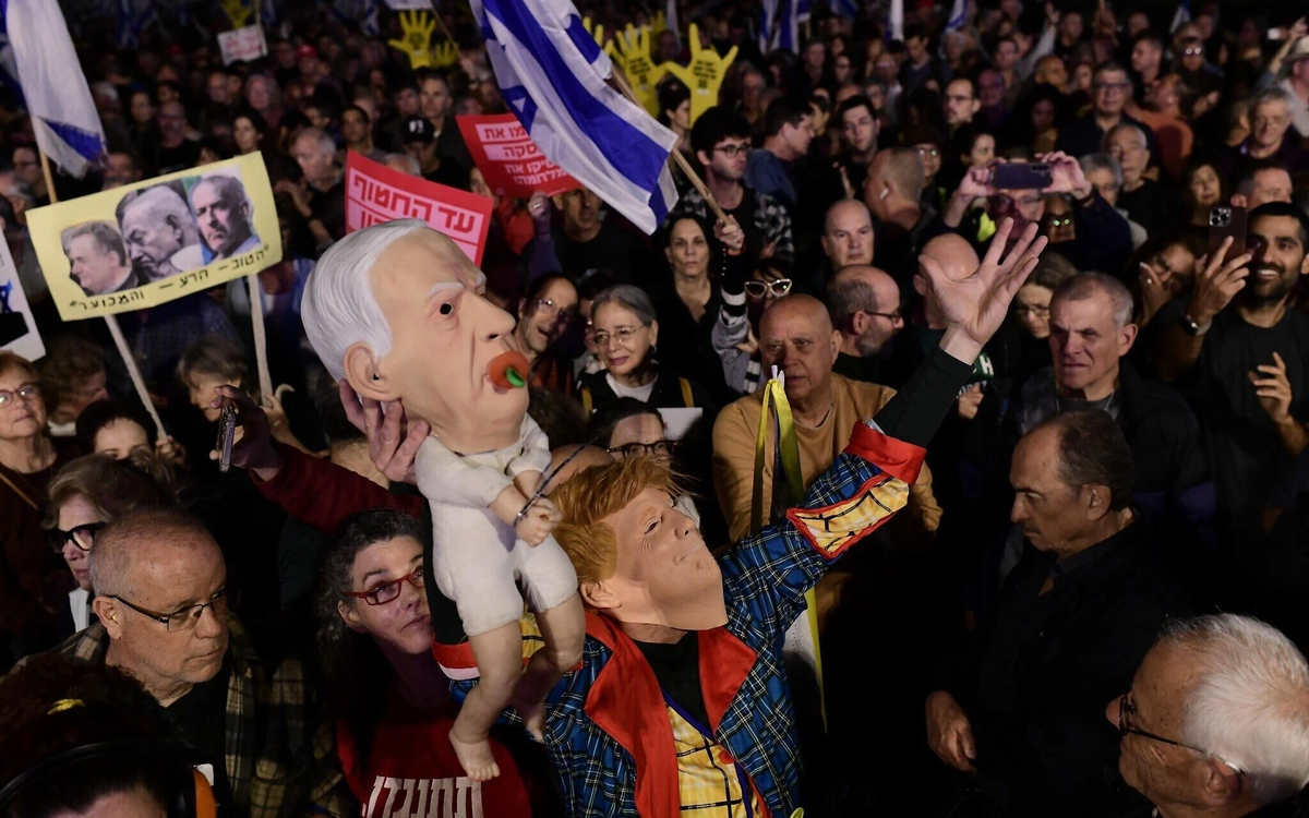 El martes por la noche 40.000 personas coparon la plaza Habima de Tel Aviv y sus alrededores para protestar contra los planes Netanyahu de destituir a Bar, en medio de una investigación sobre los presuntos vínculos entre sus asesores y Qatar.