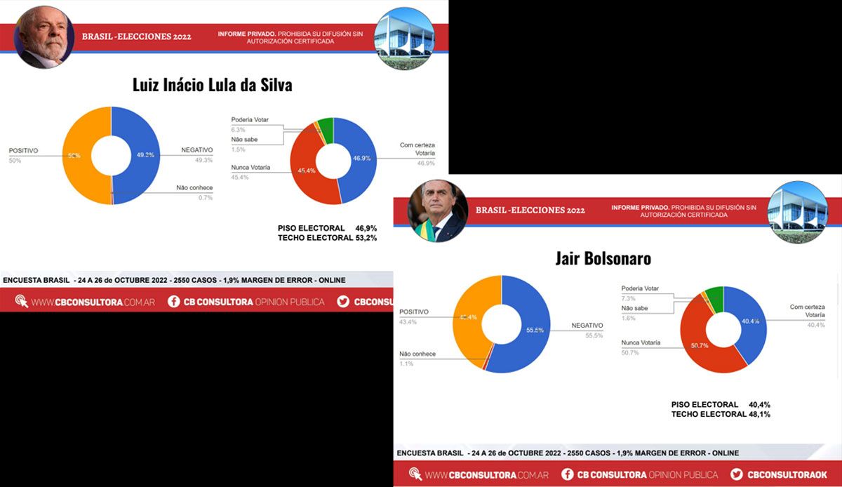 La diferencia excede el margen de error de la encuesta, por lo que queda excluido el empate técnico. "No le alcanza a Bolsonaro ni Lula está por debajo de los 50 puntos para hablar de empate técnico", aclararon desde CB Consultora ante la consulta de Urgente24.