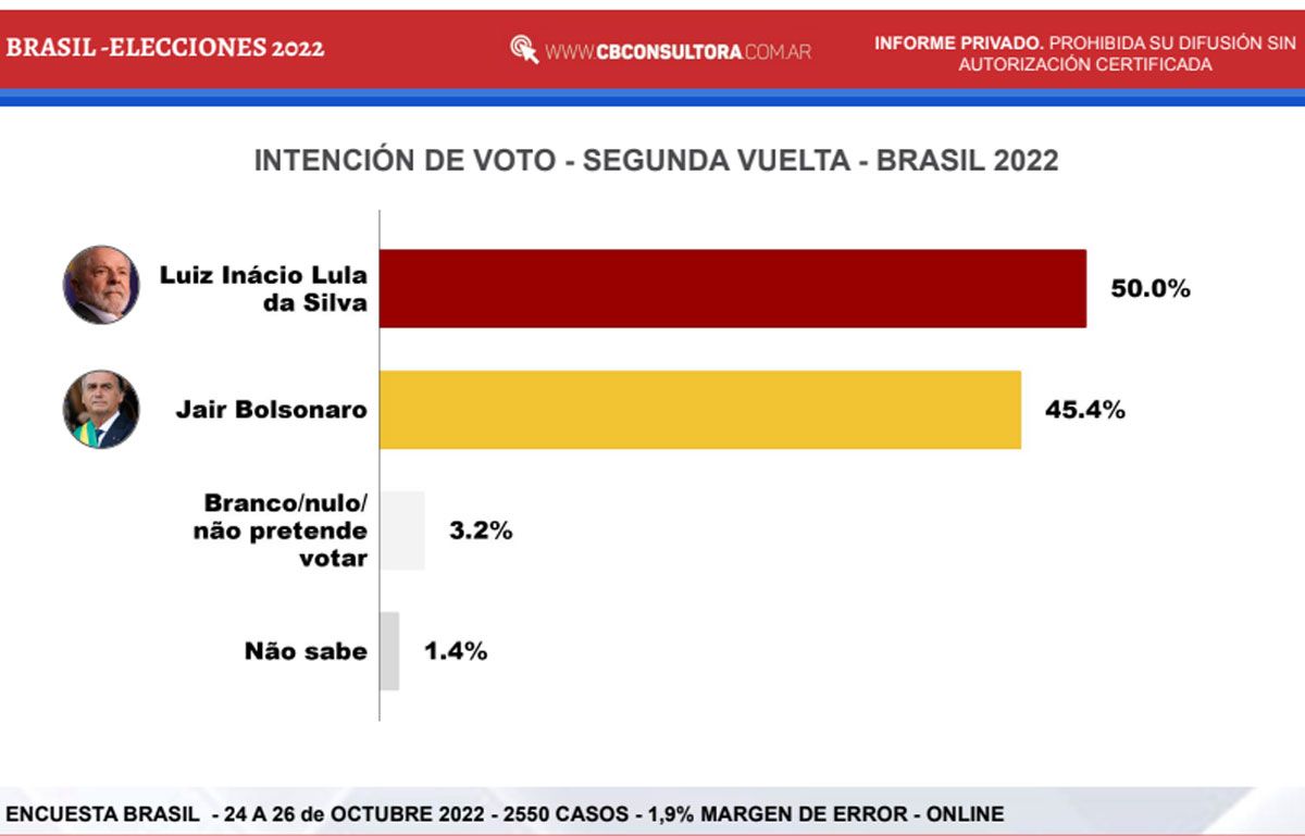 Tanto la encuesta de CB como las que hicieron las firmas brasileñas confirman a Lula como favorito para este domingo. Habrá que ver, y es la última esperanza de Bolsonaro, si la intención de voto del actual presidente de Brasil se ve subestimada en las encuestas y puede mostrar mayor fortaleza electoral, como se vio en la primera vuelta.