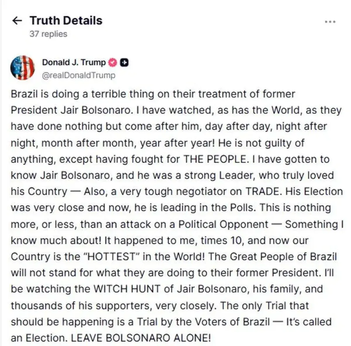 “¡Vigilaré muy de cerca la CAZA DE BRUJAS contra Bolsonaro, su familia y sus miles de seguidores!”, escribió Trump.
