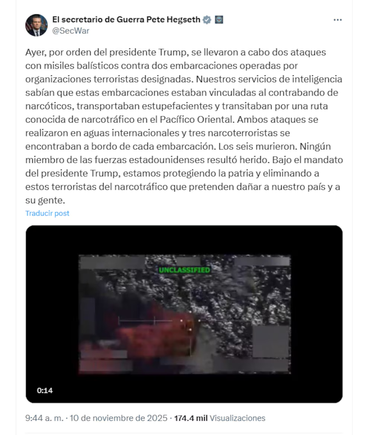 En la publicación, Hegseth aseguró que los muertos eran narcotraficantes, a pesar de que, una vez más, el gobierno de Donald Trump aún no haya demostrado pruebas contundentes que acrediten que los 76 muertos en los 19 ataques estadounidenses en el Caribe y el Pacífico oriental sean realmente narcos.