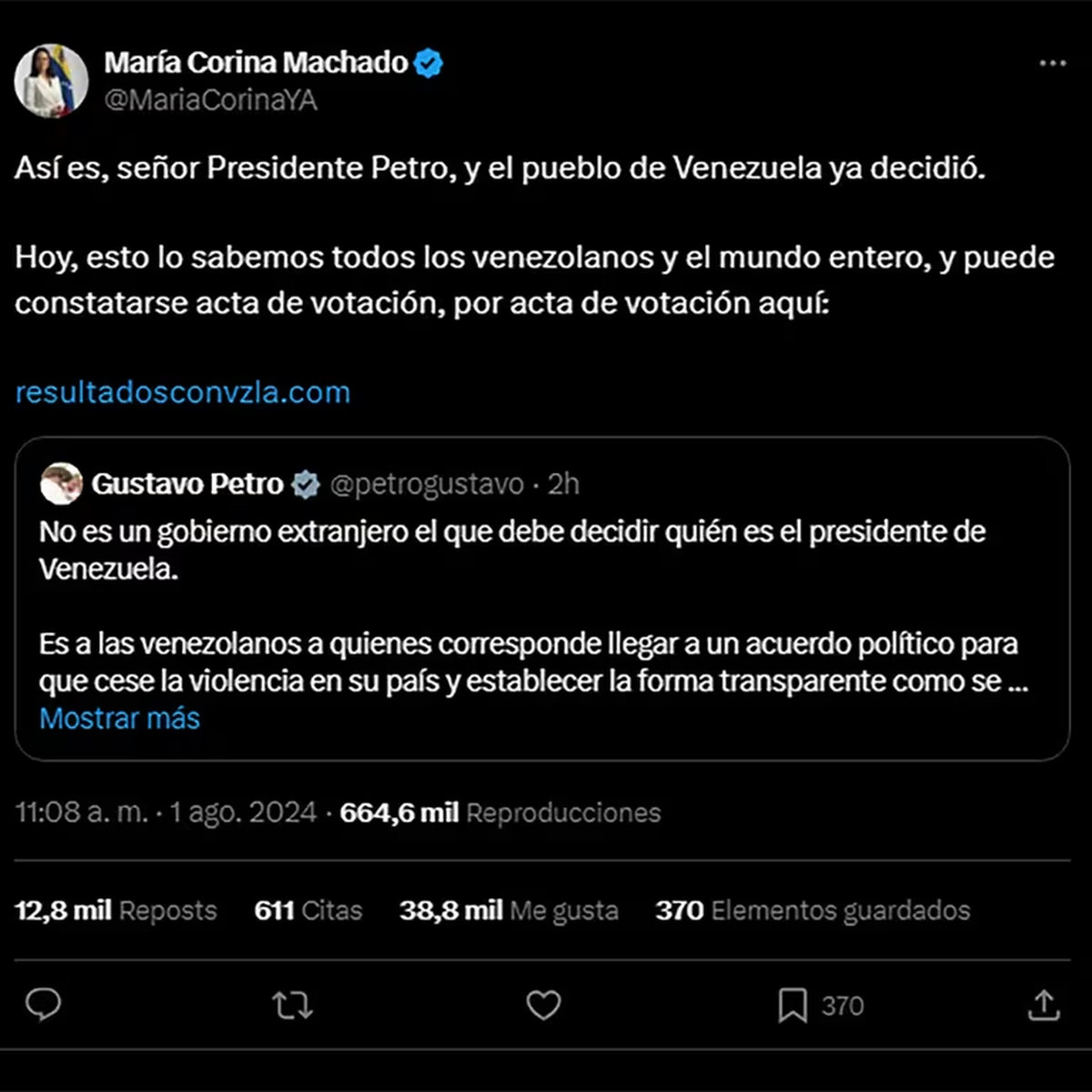 “Así es, señor Presidente Petro, y el pueblo de Venezuela ya decidió. Hoy, esto lo sabemos todos los venezolanos y el mundo entero, y puede constatarse acta de votación, por acta de votación aquí: https://resultadosconvzla.com”, escribió la líder de "Vente Venezuela" que integra la coalición opositora Plataforma Unitaria (PU) con Edmundo González Urritia, quien se habría coronado como ganador de los comicios presidenciables pese a que el Consejo Electoral de Venezuela dio como vencedor a Nicolás Maduro.