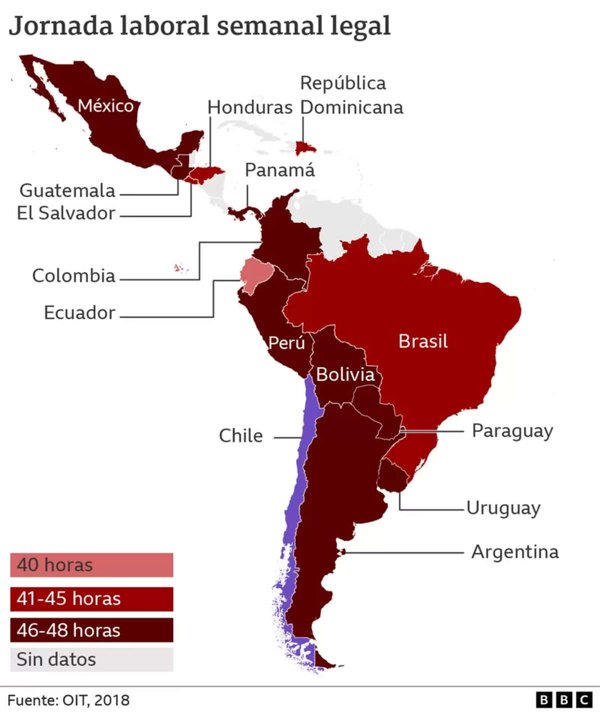 En lo que respecta a países de habla hispana, Argentina, Colombia, Perú y México encabezan la jornada laboral más extensa. Este último se halla en el podio de las naciones con más horas trabajadas por individuo durante cada año (2.225 horas anuales), según la Organización para la Cooperación y Desarrollo económico (OCDE)