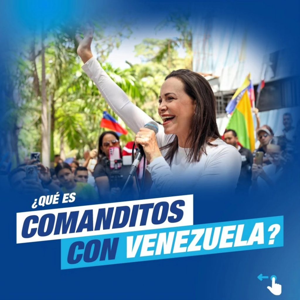 “Ubiquen el centro de votación más cercano a su comandito. Ubiquen a otros comanditos que estén en la misma zona y prepárense para las tareas que realizarán el 28 de julio. Movilicen a los vecinos, apoyen la logística y la defensa cívica de nuestros centros de votación”, les pidió María Corina de manera inicial a través de la semi clandestinidad que otorgan las redes sociales.