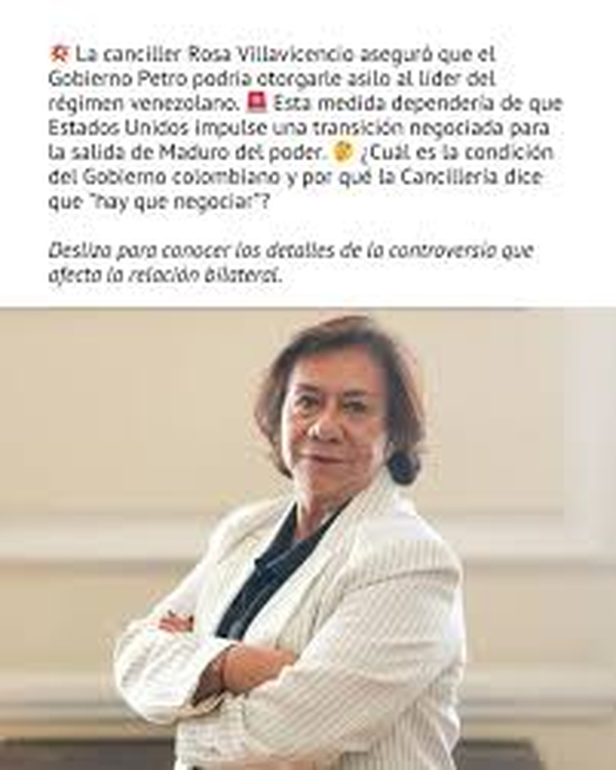 En una entrevista con Caracol Radio, Villavicencio explicó que “en el momento de tensión que existe, pues hay que negociar, y seguramente, si Estados Unidos exige una transición o un cambio, pues es una cosa que ellos deben valorar. Y si esa salida implica que deba vivir en otro país o pedir la protección, pues Colombia no tendría por qué decirle que no”.