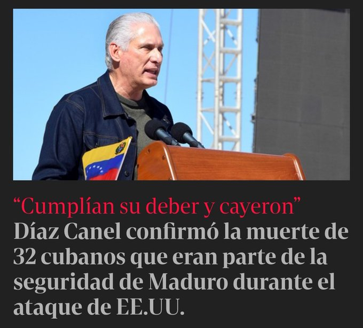 "Víctimas de un nuevo acto criminal de agresión y terrorismo de Estado, perpetrado contra la hermana República Bolivariana de Venezuela por parte de Estados Unidos, perdieron la vida en acciones combativas y tras férrea resistencia 32 cubanos, quienes cumplían misiones en representación de las Fuerzas Armadas Revolucionarias y el Ministerio del Interior a solicitud de órganos homólogos del país sudamericano".