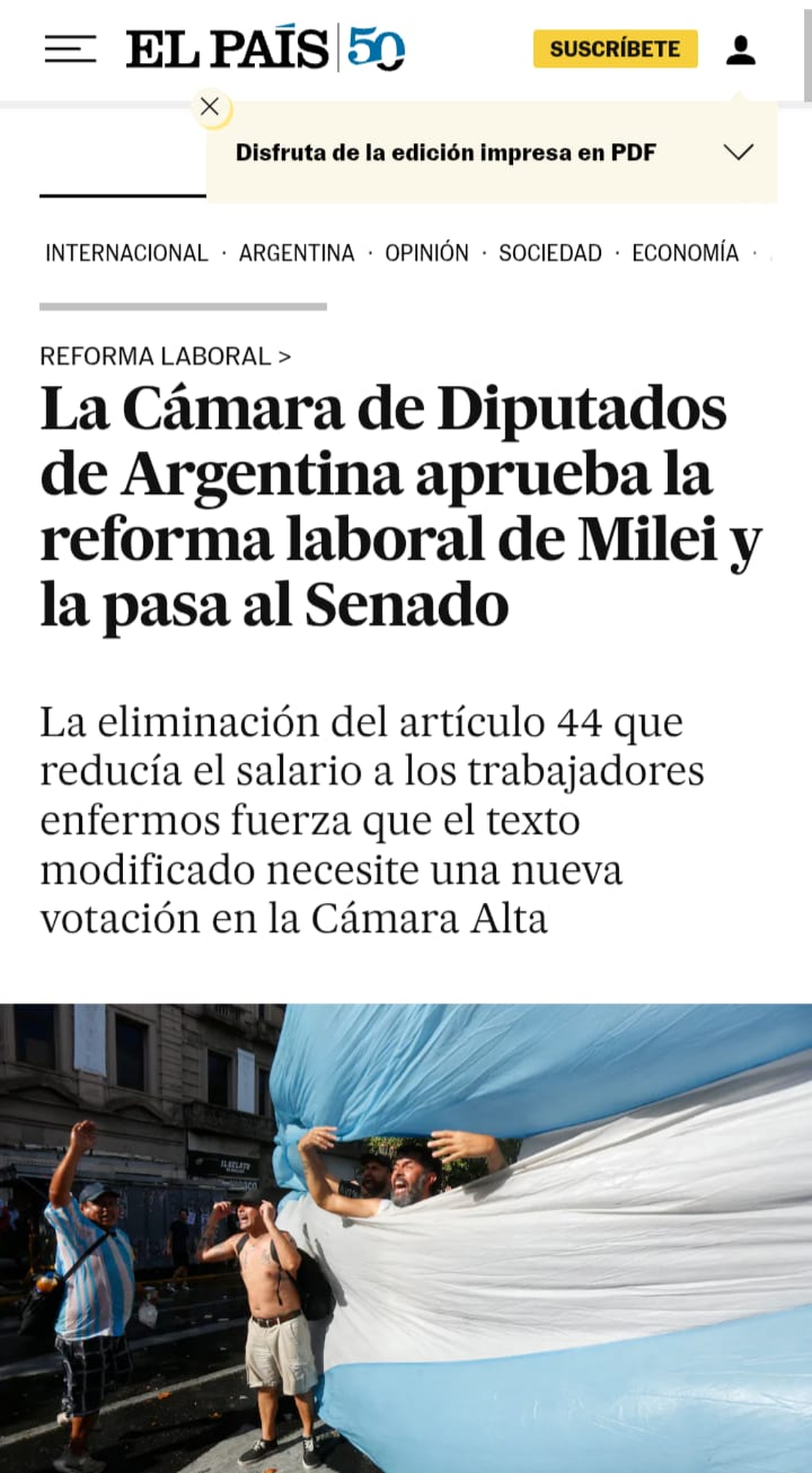 Los diarios internacionales dedicaron este viernes al debate en Argentina de la reforma laboral, destacando que logró su media sanción en Diputados y que volverá al Senado para su aprobación final tras la eliminación del artículo 44 que modificaba las licencias por enfermedad al reducir los haberes del trabajador enfermo del 100 % al 75 % o 50 %.